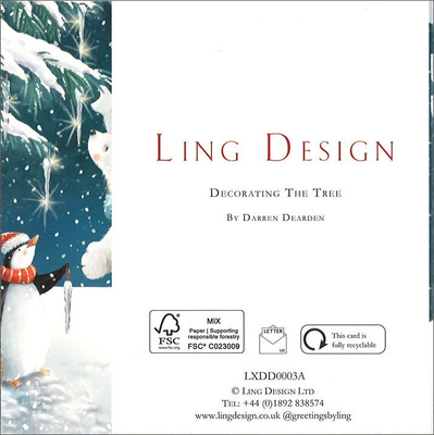 仲良くツリーの飾りつけをするペンギンとシロクマの愛らしいイラストが、冬のあたたかいひとときを感じさせます。